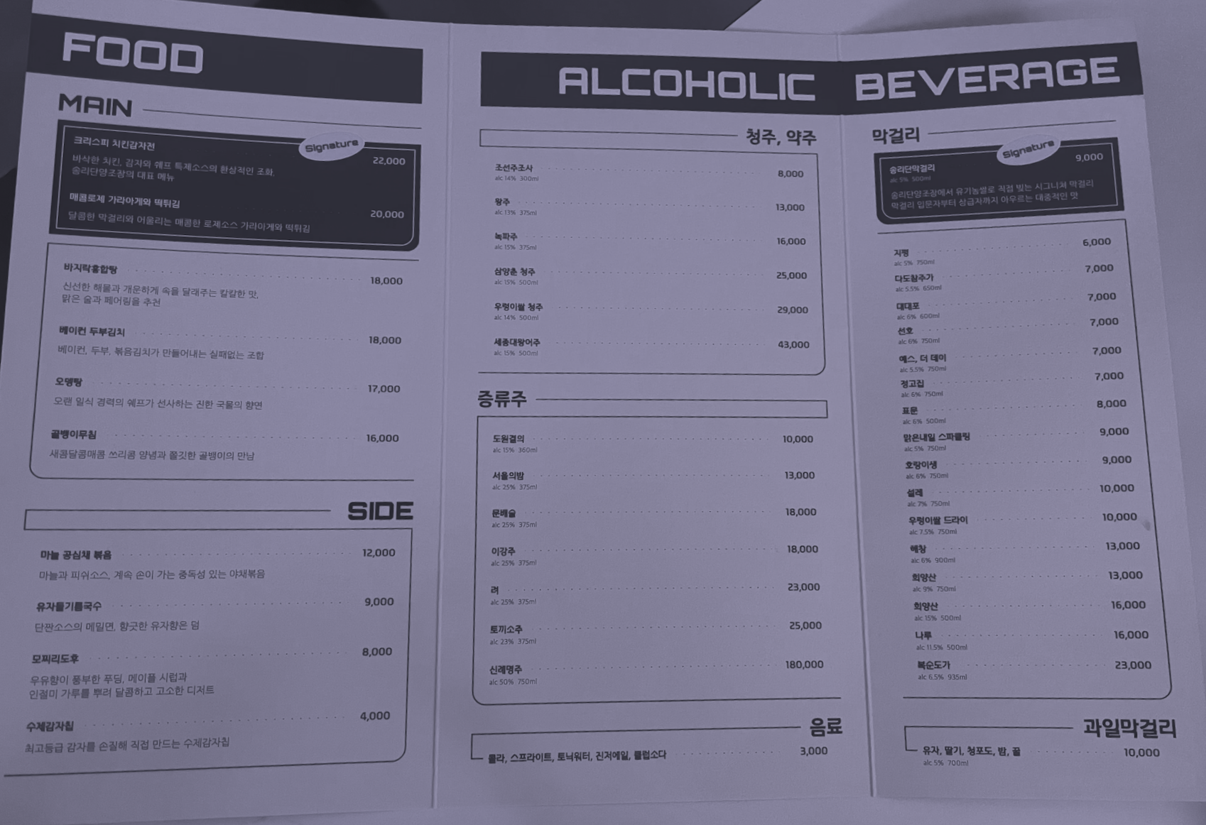 송리단 양조장의 메뉴입니다. (푸른끼가 너무 돌아서 잘 안보이길래 보정했어요 ㅋㅋ)