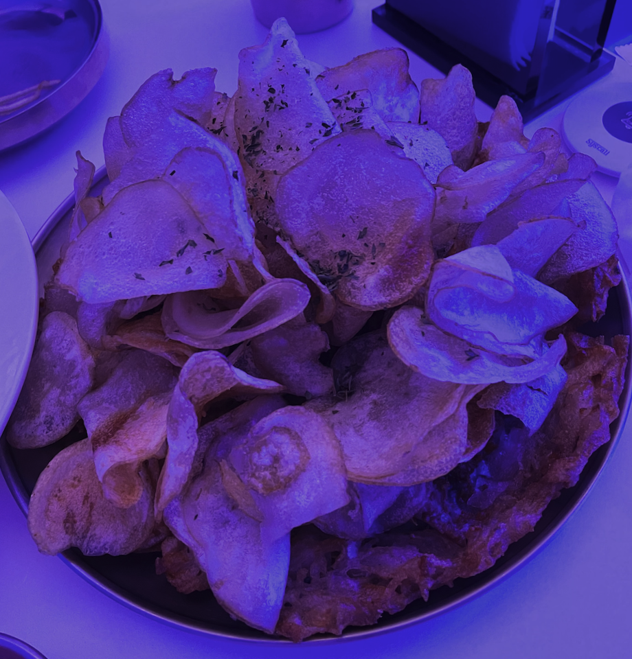 크리스피 감자전은 감자전 위에 감자칩이 아주 많이 뿌려져 있고, 감자전 위에 닭가슴살 조각 튀김같은 것들이 올려져 있어요.